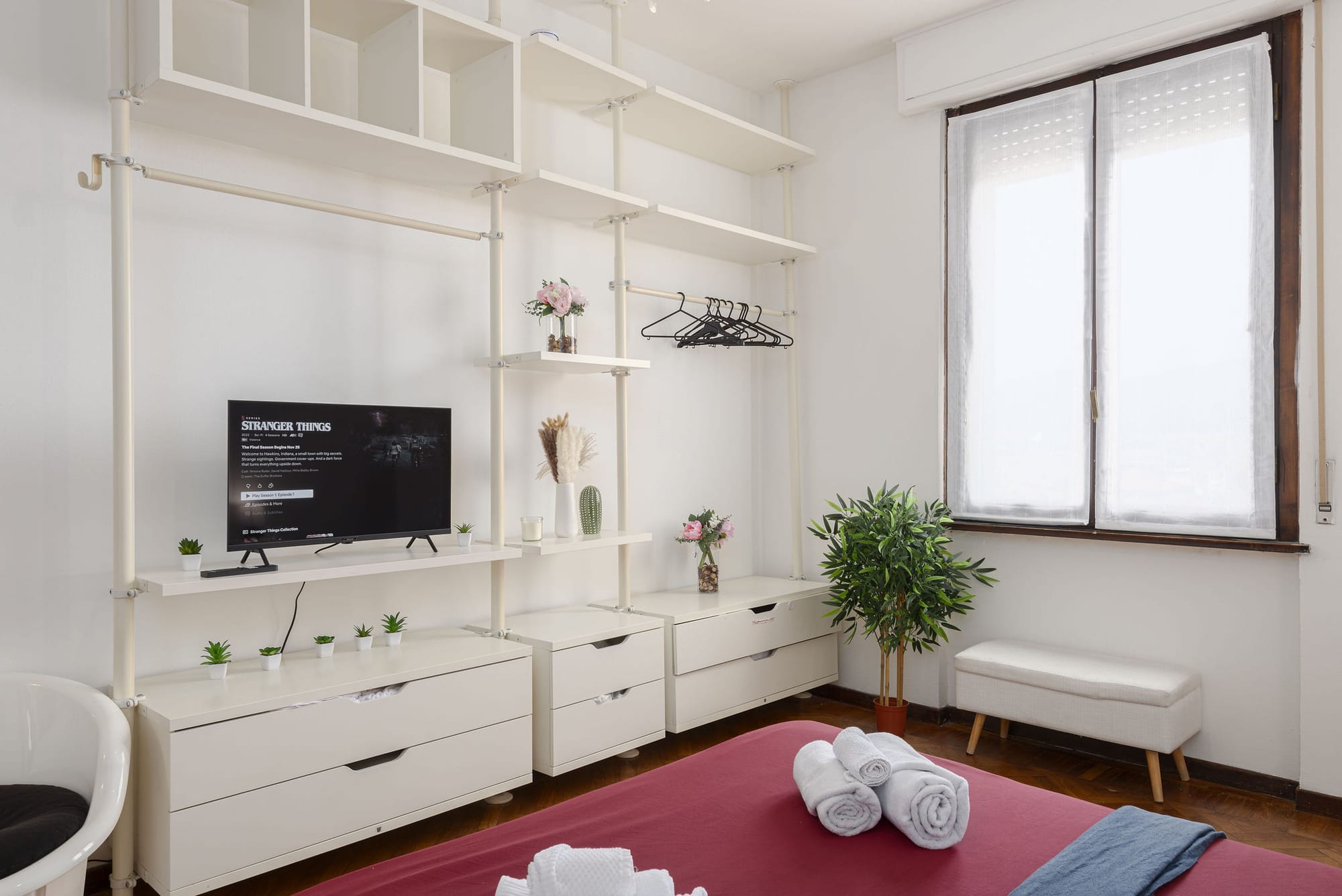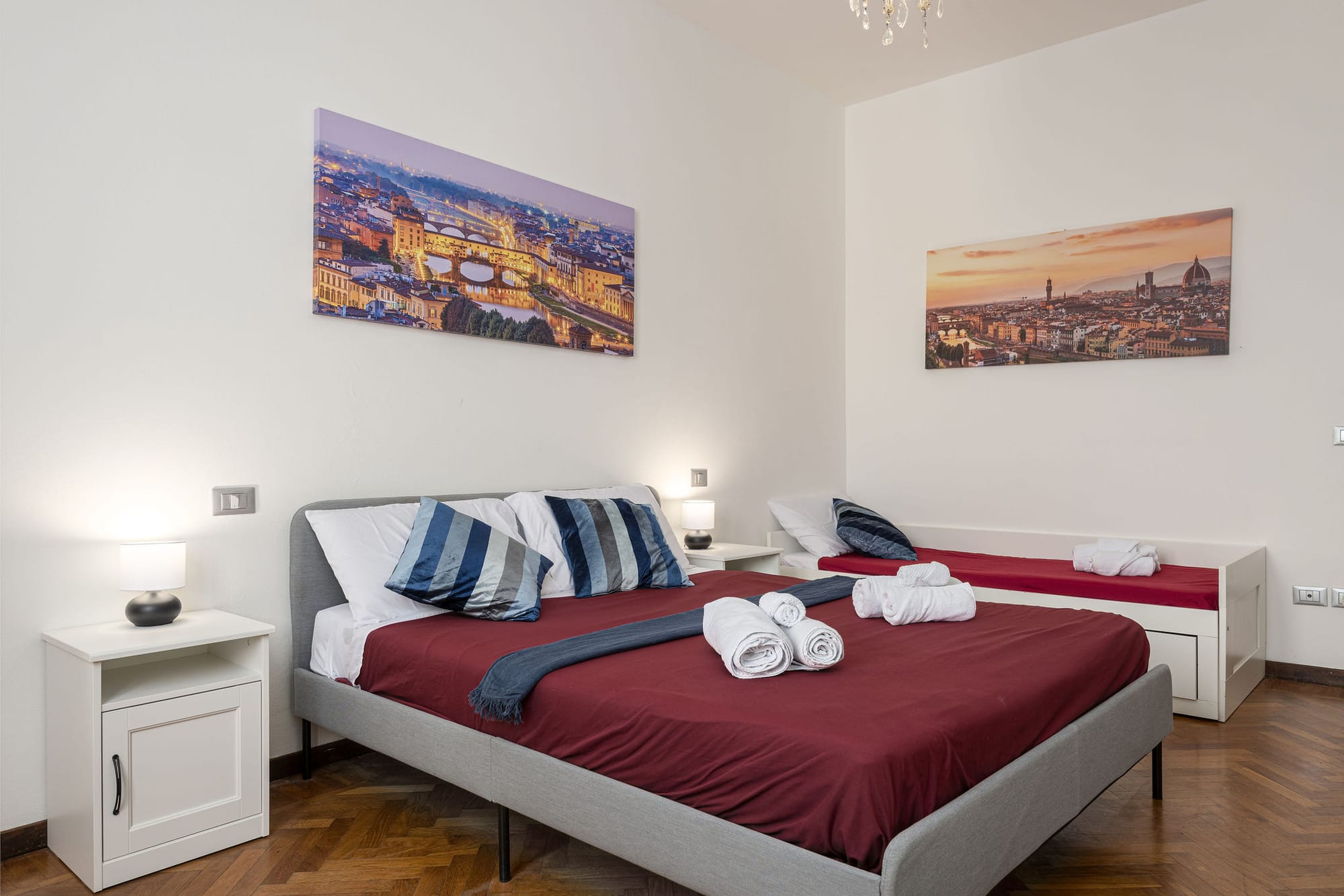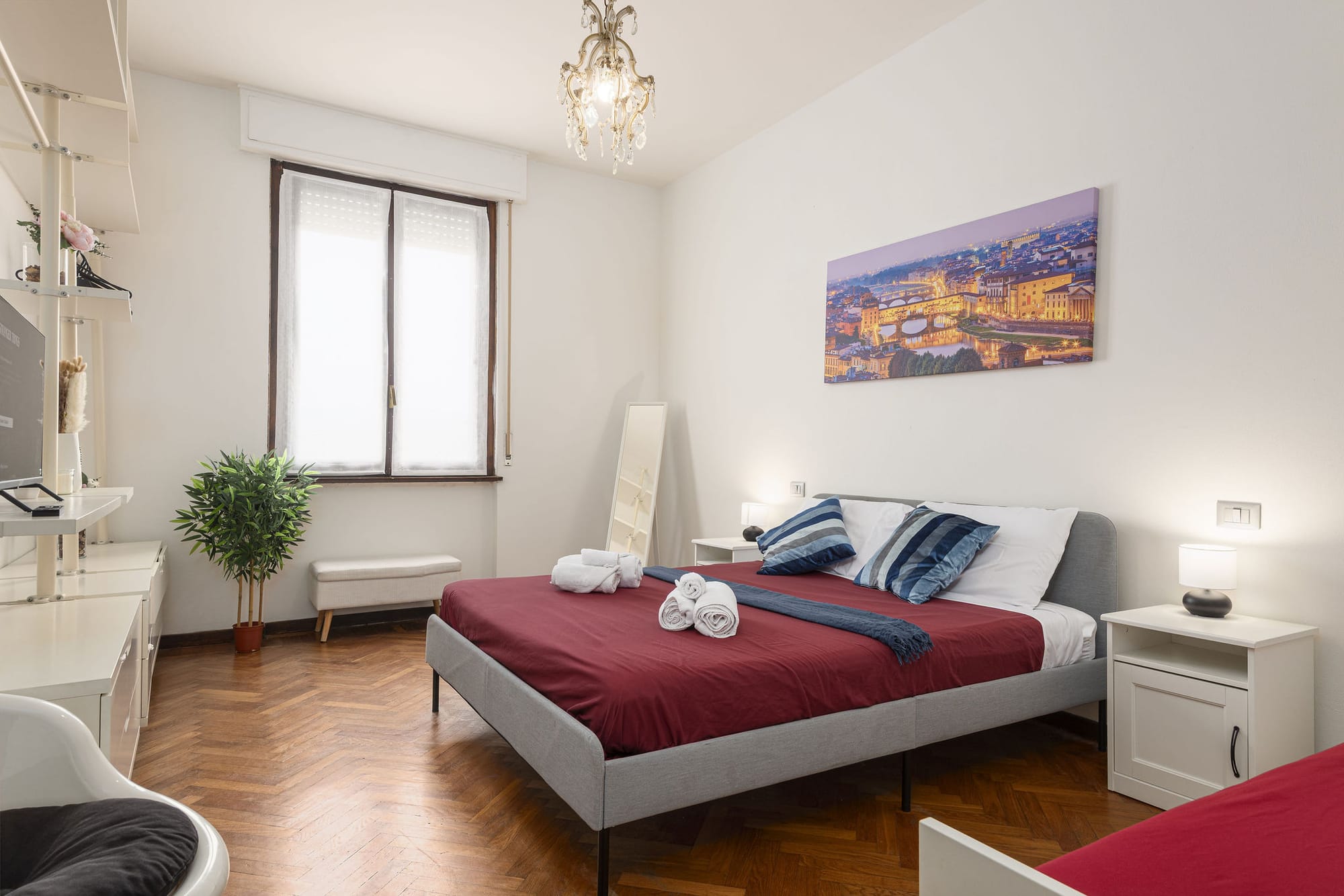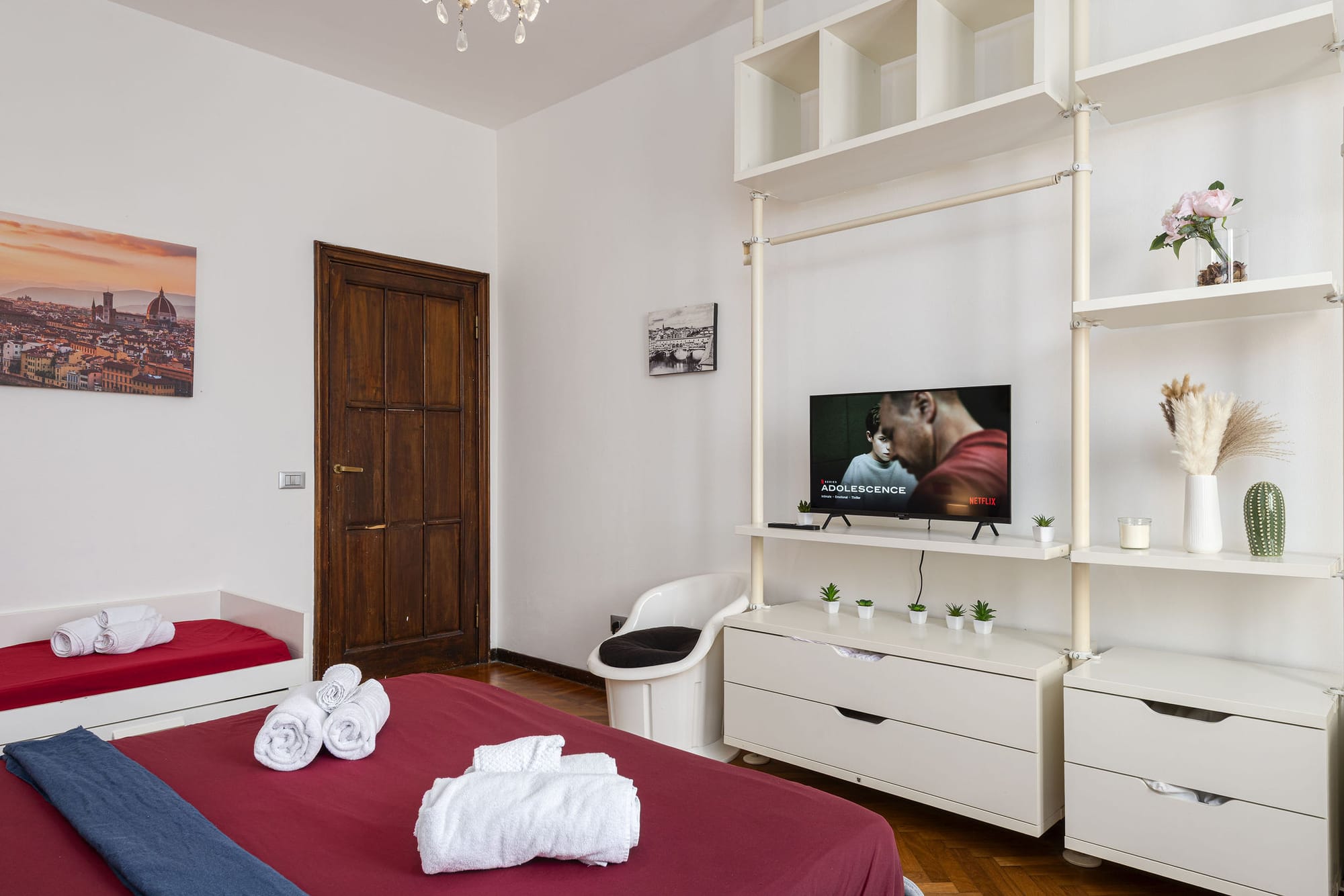 La seconda camera da letto, spaziosa e versatile, è arredata con un letto matrimoniale e un letto singolo, una TV smart a schermo piatto, un armadio e uno specchio, offrendo un ambiente ideale per il relax di tutti gli ospiti.