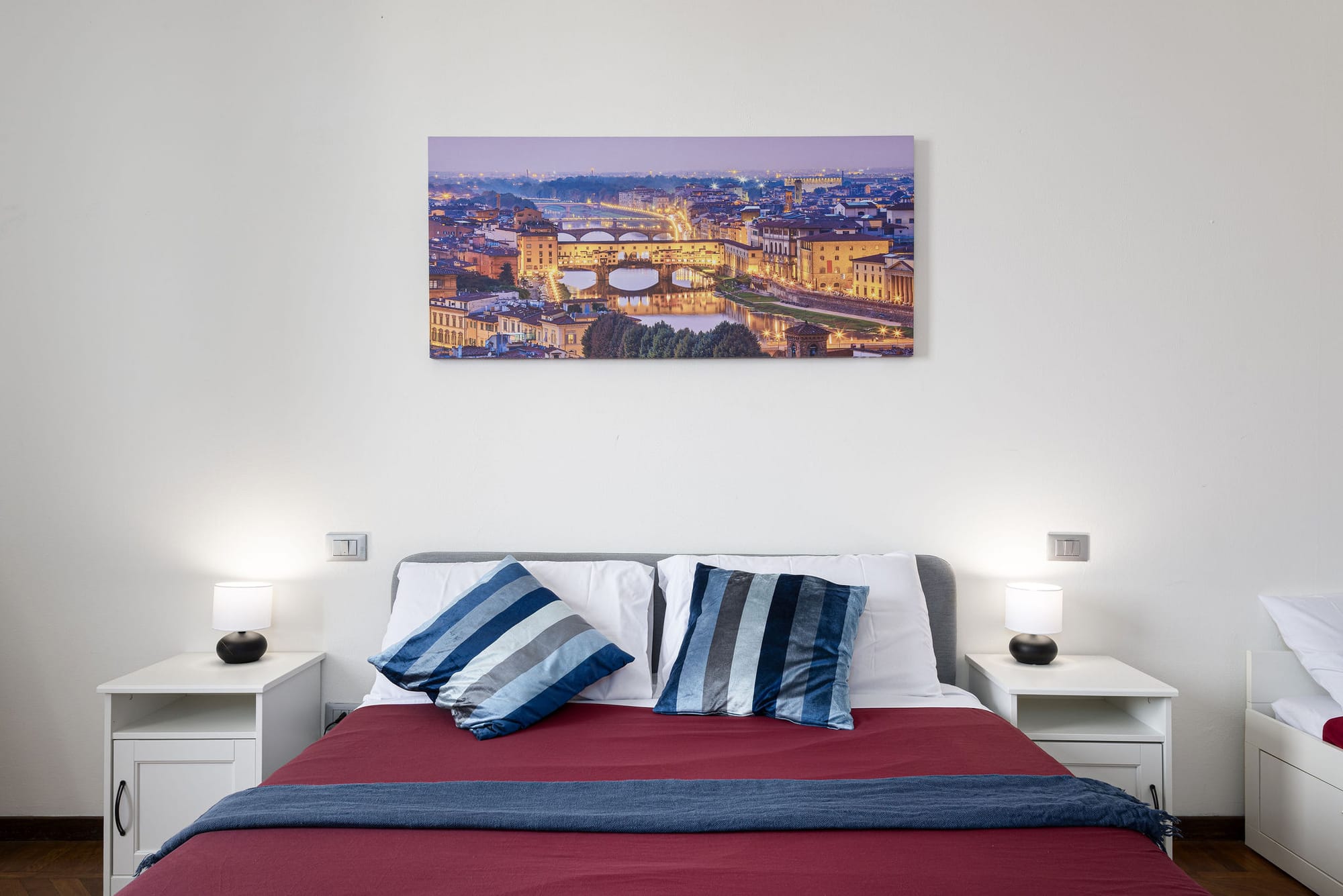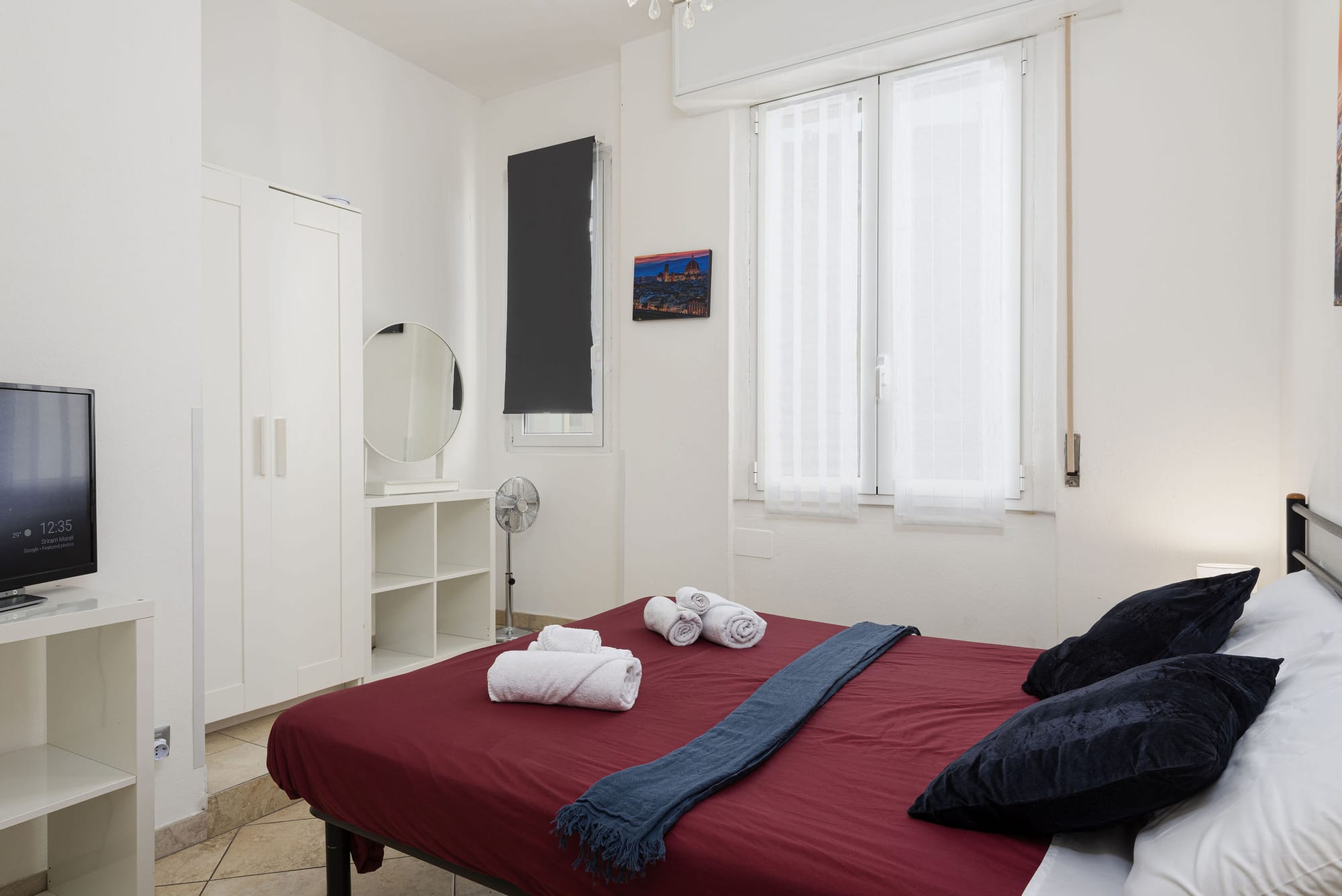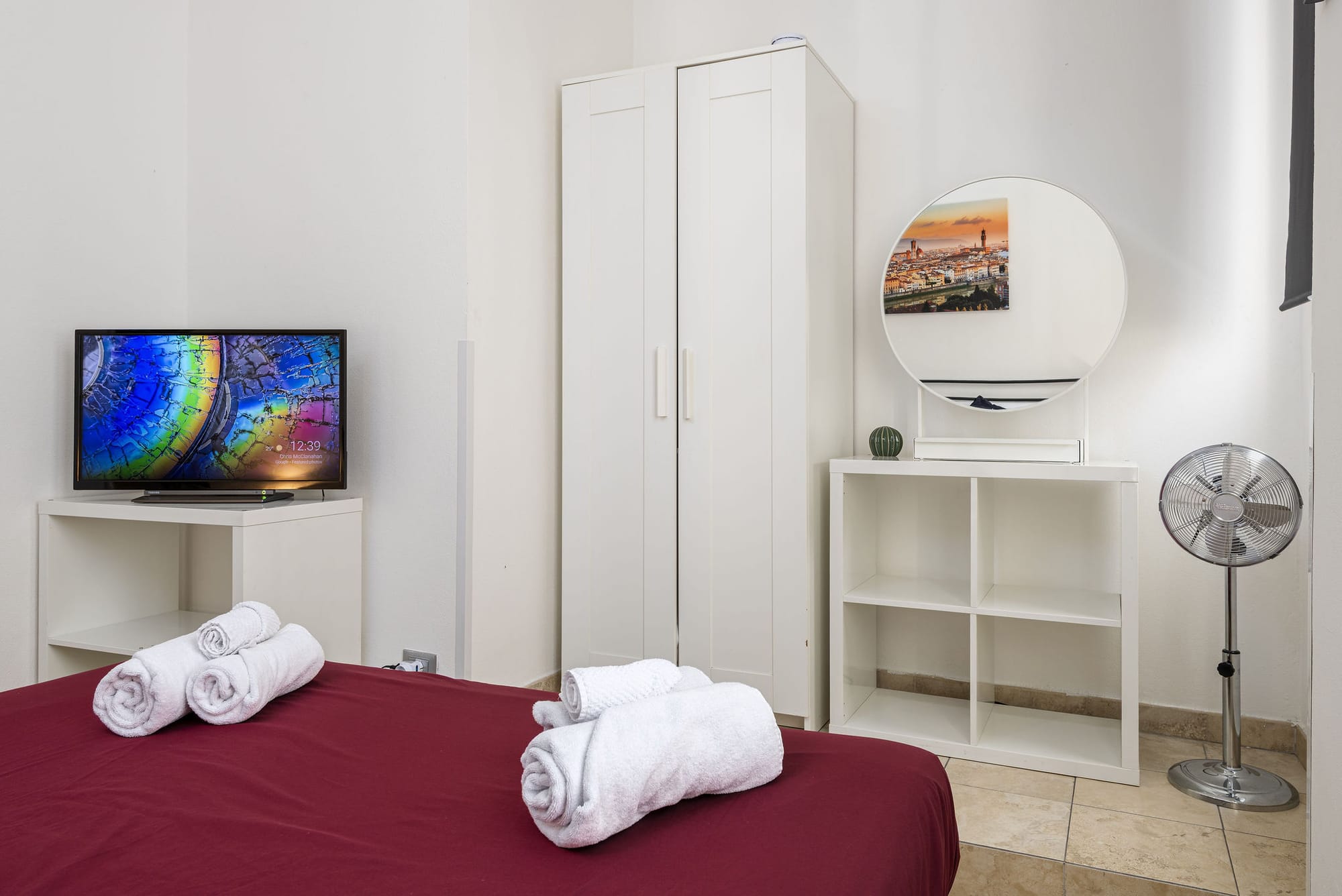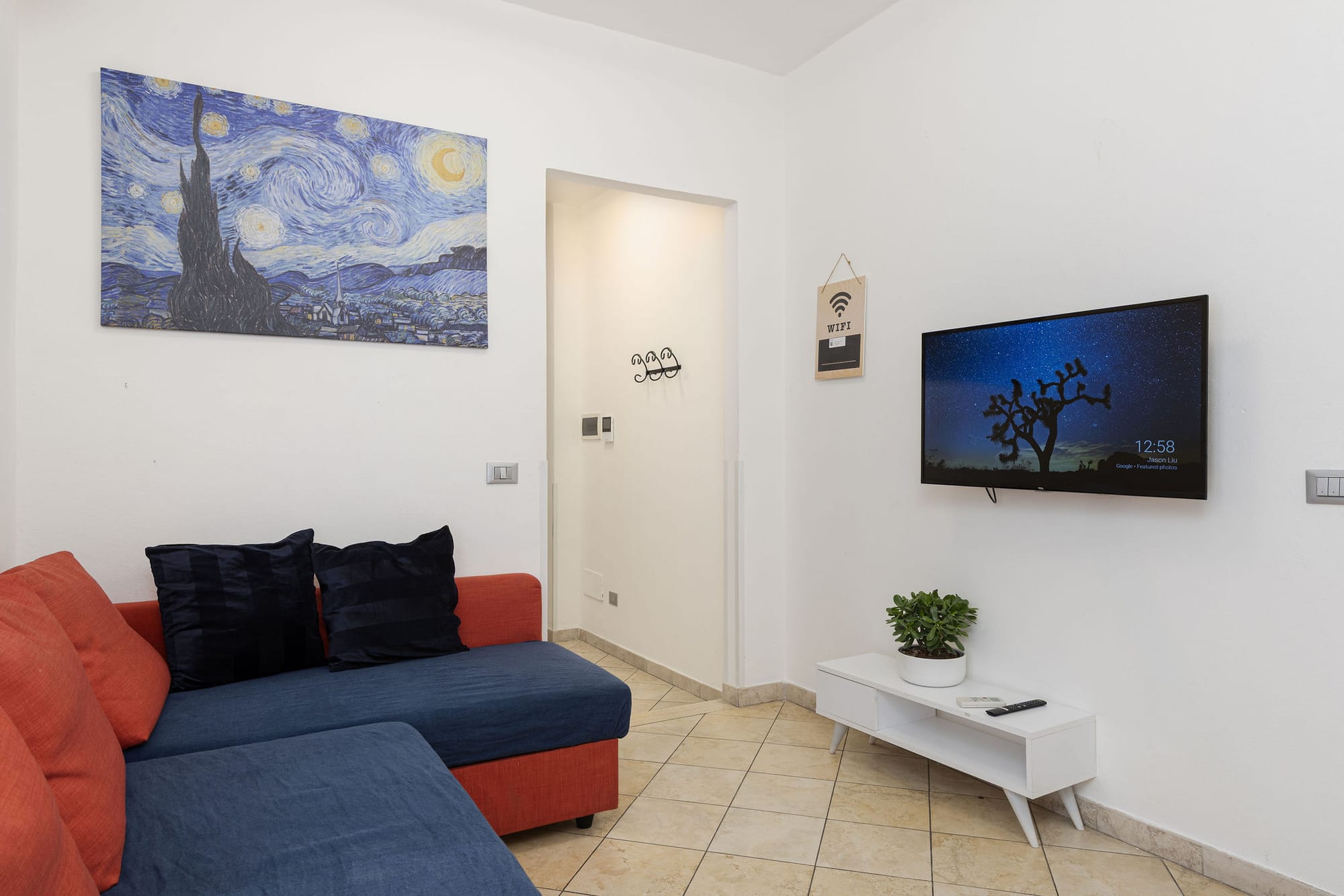 La seconda camera da letto, spaziosa e versatile, è arredata con un letto matrimoniale e un letto singolo, una TV smart a schermo piatto, un armadio e uno specchio, offrendo un ambiente ideale per il relax di tutti gli ospiti.